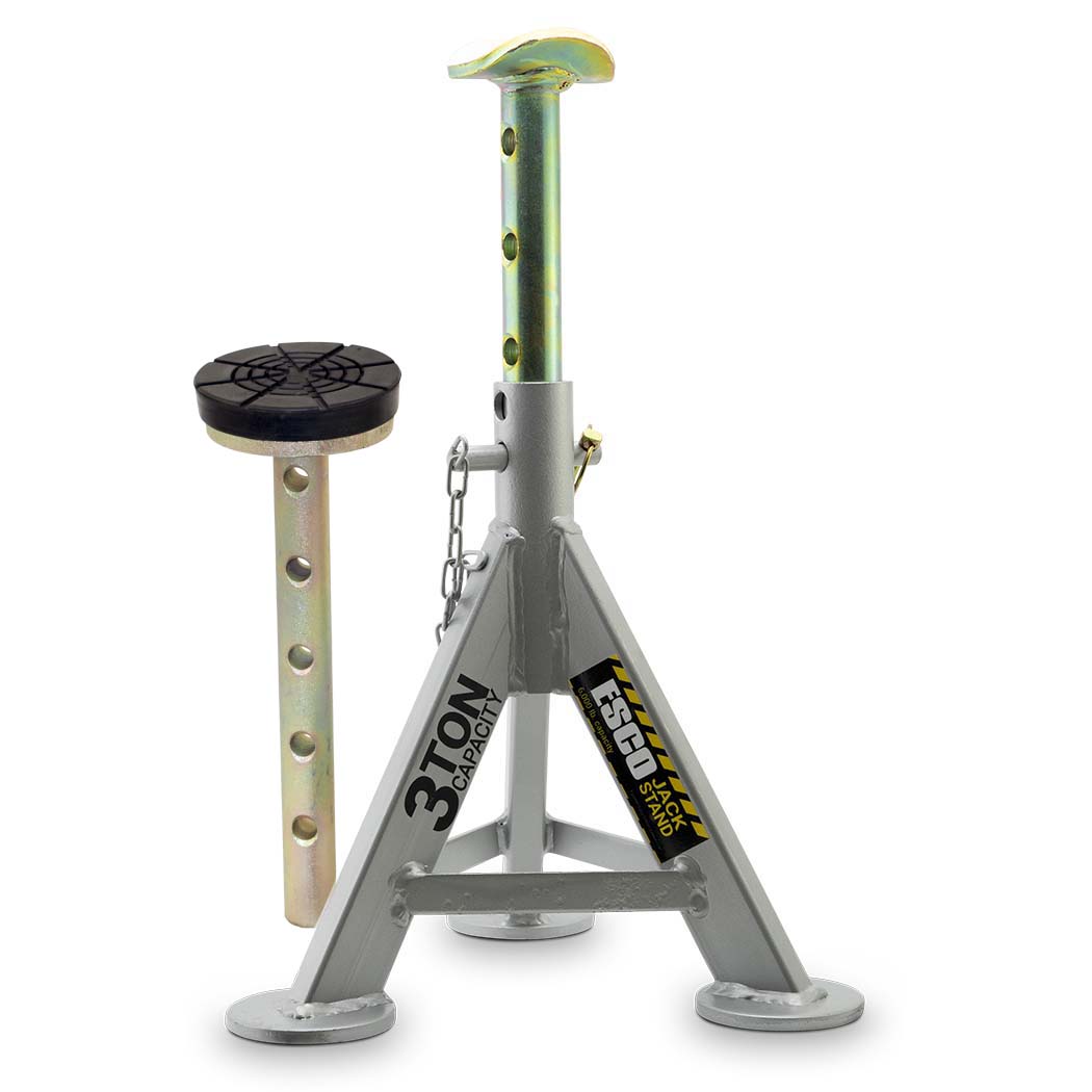 The ESCO 3 Ton Performance Jack Stand Kit (Model 10498K) is a single jack stand that includes 2 types of interchangeable support posts. Easily switch from the axle top post or rubber padded flat top post depending on vehicle or project. The flat-top removable rubber saddle cushion post protects the car frame and the axle top post is great for supporting vehicle axles and other rounded surfaces. Circular base pads allow for maximum stability and safety. The stand has a powder-coated finish to prevent rusting. Quickly and safely lock the position with the included locking pin. This professional-grade jack stand is perfect for a home garage or shop. Includes 1 jack stand with a rubber top post and axle top post offering exceptional grip and support.