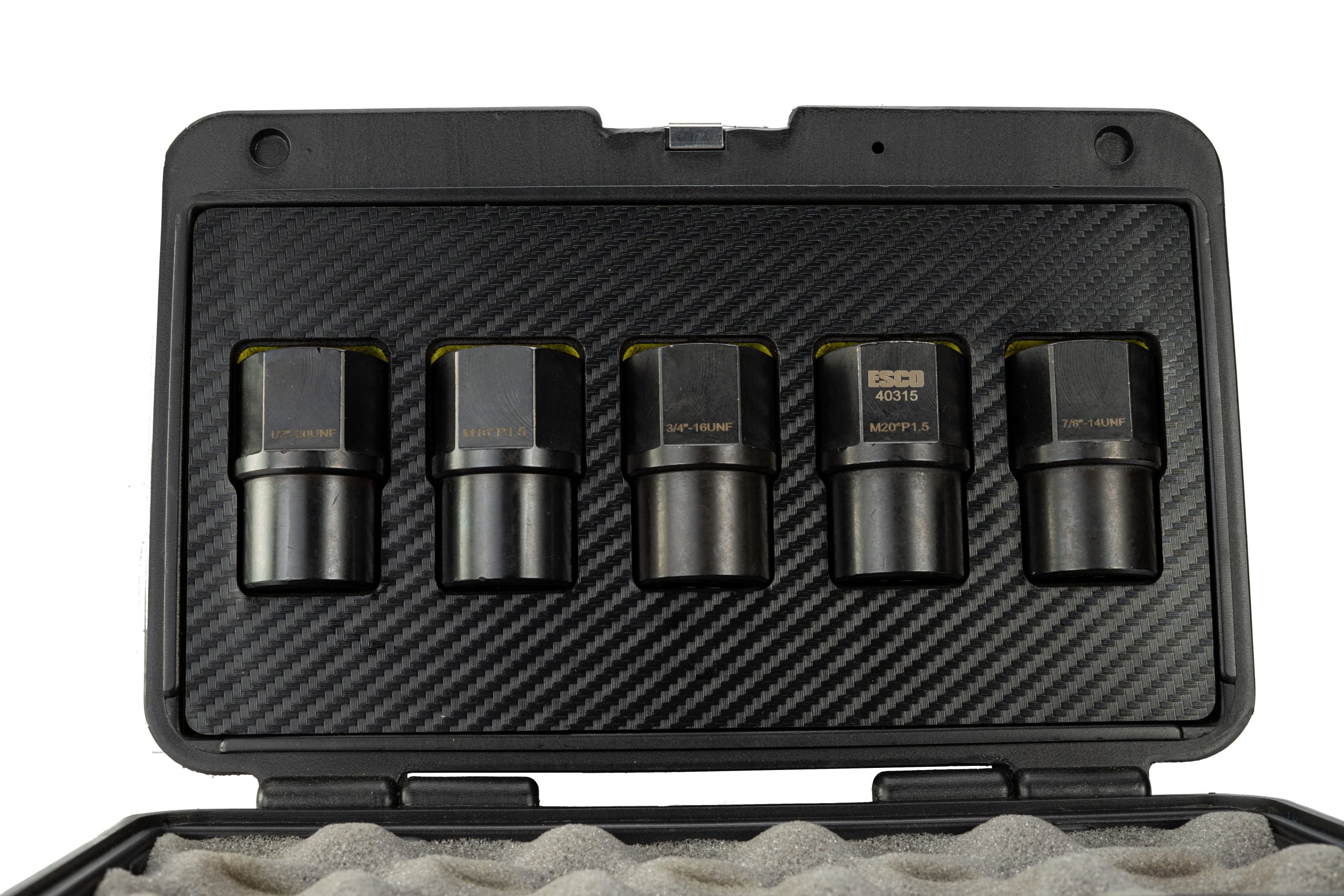 The ESCO Heavy Duty Tie Rod End Remover – Commercial Set (Model 40315) comes with five individually marked tie rod end sockets that are designed to “shock” tie rod ends loose without damaging threaded areas, rubber seals, or oil nipples. Each socket is manufactured and designed to withstand rigorous use in a professional environment and comes in a fitted case for easy storage.