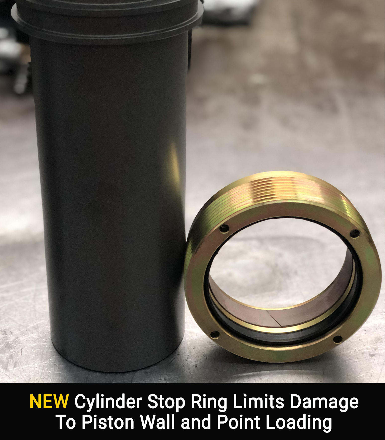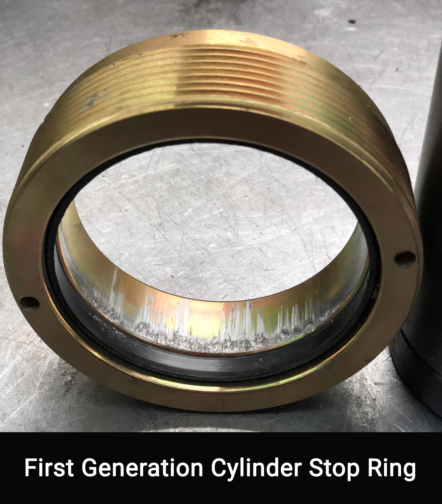 The first-generation cylinder stop ring had a single groove machined for the piston rod wiper. The wiper kept internal contamination to a minimum, as was designed, it also created a slight side to side movement. This movement increased point load situations which, in turn, caused severe scarring on the outside walls of the piston rod as well as the internal walls of the cylinder.