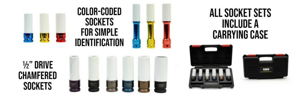 New ESCO Specialty Socket Sets are available in three unique sets within convenient carrying cases. All sockets are color-coded sockets for simple identification and contain the most popular size lug nuts for the performance market. Designed for use with impact tools, all sockets within the new sets are manufactured out of CR-MO Alloy Steel for long-lasting use and durable sleeves protect wheels and nuts from marring or damage.
