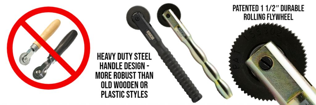 Manufactured with a robust steel handle for long-lasting use, ESCO Heavy Duty Stitcher Tire Patch Repair Roller Tools are available in two styles: one with a galvanized handle and the other with a matte black steel handle. ESCO Heavy-Duty Stitchers are both designed with deep-cut teeth in a wheel for maximum adhesion, freeing any trapped air, equipped with a patented 1 & 1/2″ durable rolling flywheel for shops that handle high-volume tire repairs.