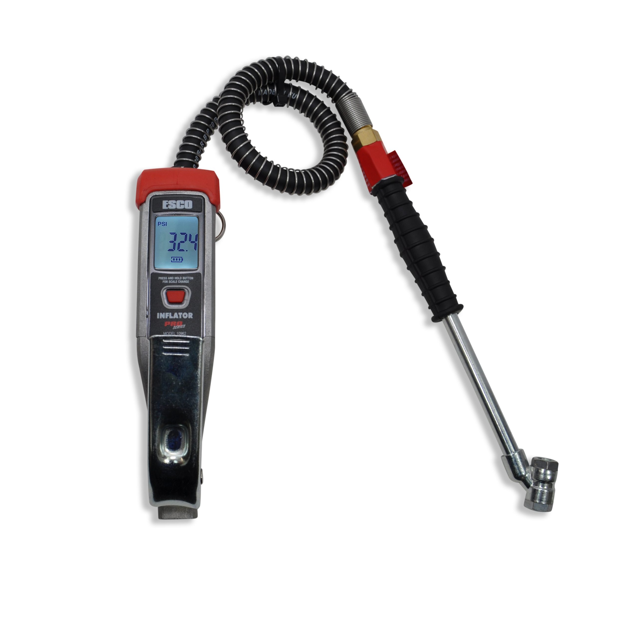 The ESCO “Compact” Digital Tire Inflator (Model #10962) is a single trigger handheld tire inflation unit designed to meet the demands of daily use in workshops or out in the field on service vehicles. This digital compact design inflator is constructed to withstand constant use, with a robust rubber casing that provides additional shock resistance when being used daily. It’s easy to read and view digital backlit screen and single button design makes it easy to use and a huge asset in the shop for all inflation needs. With an accuracy rating of +/- 2 psi and a 1-year warranty, this professional inflation unit is perfect for any inflation application.